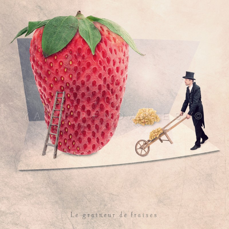 Photography "the strawberry seed-sticker", from my photo series "The tiny trades". These fun prints are self-portraits representing imaginary small trades.