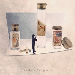 Tirage photo original tiré de la série " Les Tout Petits Métiers". Disponible dans différents formats, de la carte postale au très grand format sur papier Fine Art ou toile montée sur un châssis de bois. Cette photographie ludique représente mon autoportrait en train de coller des étiquettes sur des flacons.